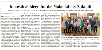 Die Schüler und Schülerinnen der Klasse 3b haben im Rahmen eines Sachunterrichtsprojektes einen Nachhaltigkeitspreis gewonnen. Dieser wurde Vertretern der Klasse im Rathaus durch die Umwelt- und Stadtentwicklungsdezernentin Doris Grondke verliehen. Der Preis wurde für die Entwicklung eines nachhaltigen Mobilitätskonzeptes für die Kieler Innenstadt verliehen, die E-Xpressbahn. Diese Elektrobahn führt entlang der wichtigsten Knotenpunkte Kiels sowie der Förde. Zusätzlich wurden Nutzungskonzepte für die Haltestellen entwickelt und in Modellen verwirklicht. Das Projekt wurde finanziell und organisatorisch unterstützt durch die Neveling Foundation.