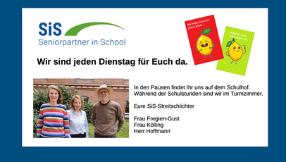 Jeden Dienstag sind zusätzlich zu unseren Streitschlichtern seit einigen Wochen auch die SiS-Streitschlichter für unsere Schülerinnen und Schüler zur Klärung von Streitereien, das Sprechen über Problemen etc. im Haus. Dies findet in einem ganz persönlichen, anonymen Rahmen statt.