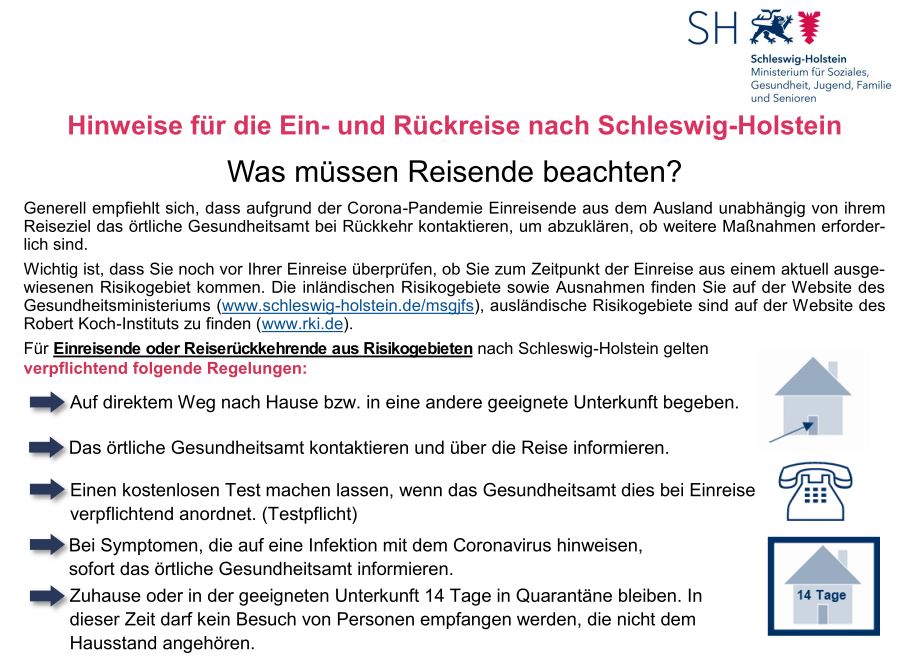 anbei finden Sie die Hinweise des Ministeriums für die Ein- und Rückreise nach Schleswig-Holstein. In diesem Dokument finden Sie Informationen, was bei etwaigen Reisen zu beachten ist.
