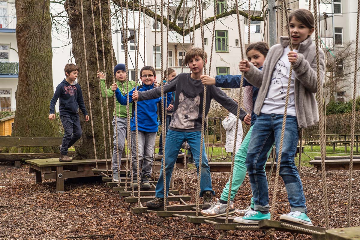 Mein Lieblingsplatz an der Schule ist der Niedrigseilgarten. Warum ist es der Niedrigseilgarten? Weil man da so gut an den Seilen klettern kann.
