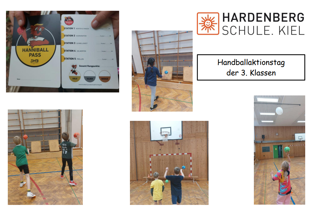 Am 03. November fand der Handballtag für die 3. Klassen statt. Jede Klasse durfte eine zusätzliche Stunde Sport machen. Die Trainerin hieß Regina und hatte für jeden einen Handball dabei. Am Anfang standen wir alle im Kreis und haben verschiedene Übungen mit dem Ball gemacht: werfen, fangen, dribbeln usw. Danach durften wir an fünf verschiedenen Stationen kegeln, zielen, fangen und vieles mehr. Das hat viel Spaß gemacht. Am Ende haben wir alle eine goldene Urkunde bekommen.