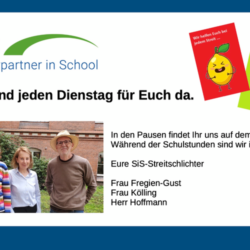 Jeden Dienstag sind zusätzlich zu unseren Streitschlichtern seit einigen Wochen auch die SiS-Streitschlichter für unsere Schülerinnen und Schüler zur Klärung von Streitereien, das Sprechen über Problemen etc. im Haus. Dies findet in einem ganz persönlichen, anonymen Rahmen statt.